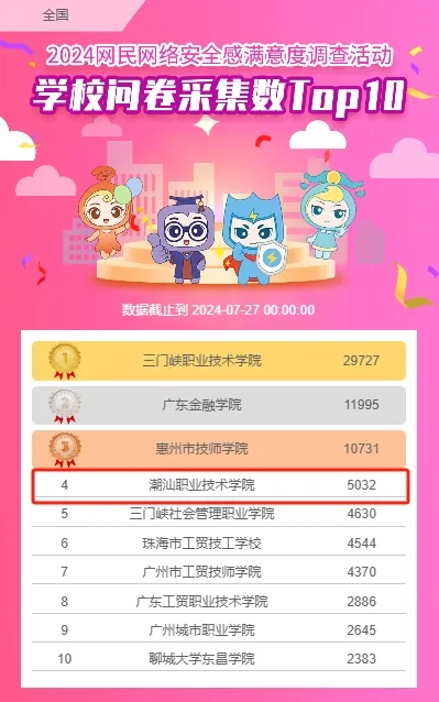 潮汕职业技术学院在揭阳网络空间安全协会的推荐下成为2024调查活动的支持单位,活动期间积极配合调查活动组委会的工作部署,组织广大师生积极参与活动,共采集到5033份网民参与答题样本,为2024调查活动的成功举办做出了突出贡献。