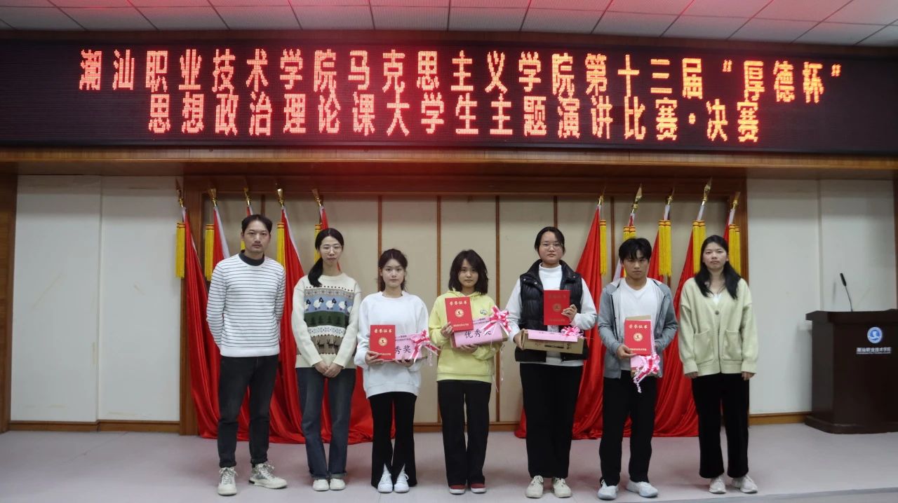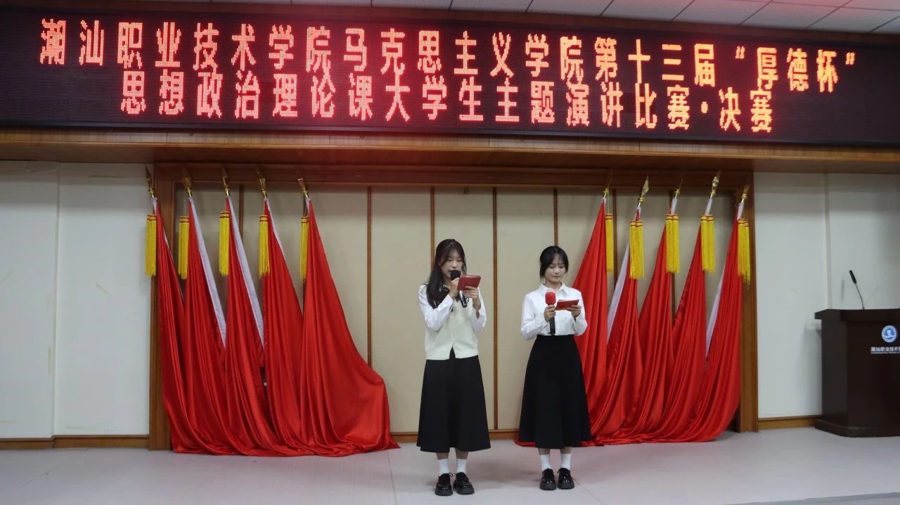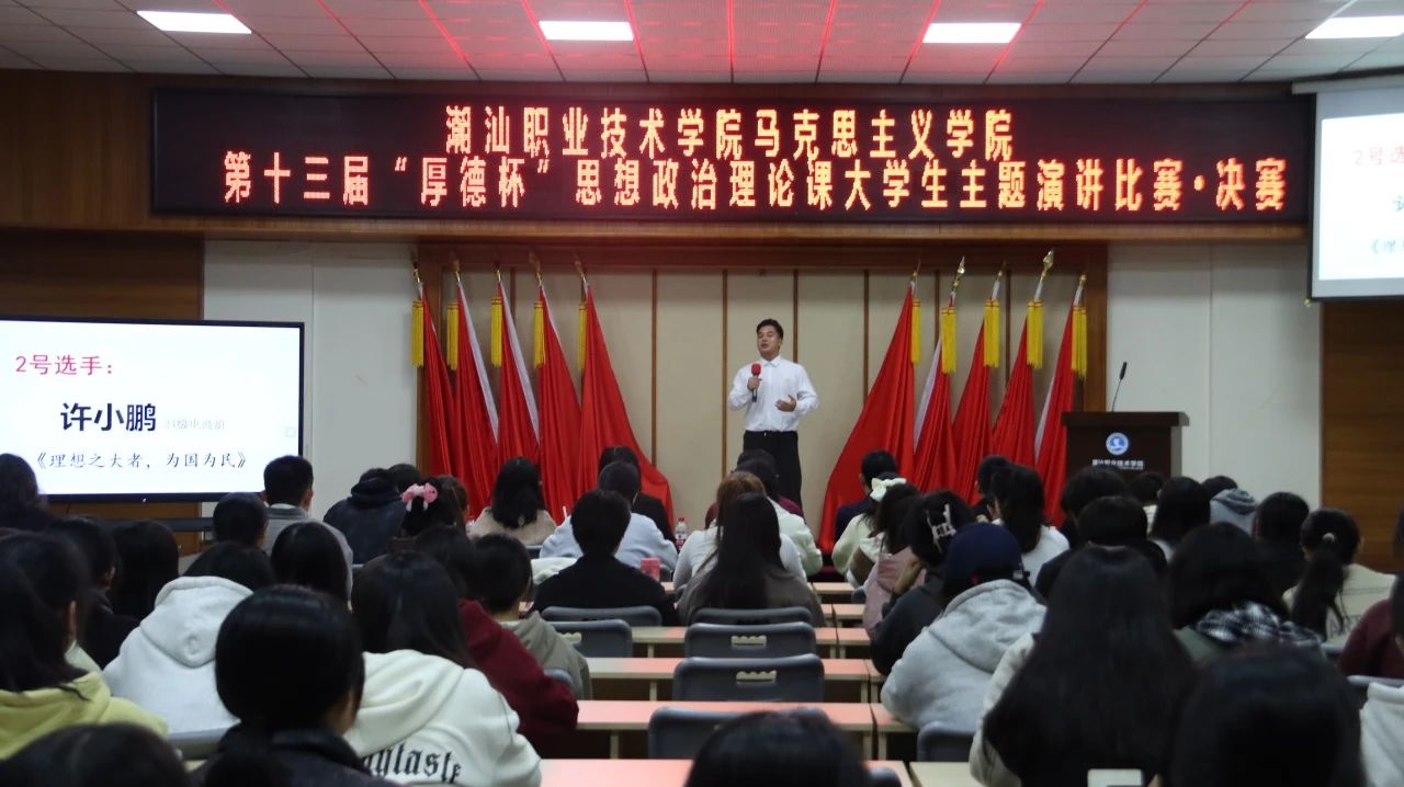 12月20日下午,作为《思想道德与法治》课程的教学实践环节,潮汕职业技术学院马克思主义学院第十三届“厚德杯”思想政治理论课大学生主题演讲比赛决赛在第二报告厅举行。